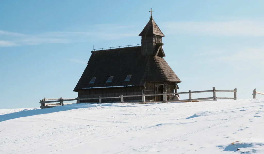 Классический образ Велика-Планины — деревянные хижины с гонтовыми (spruce shingles) крышами, которые почти «спускаются» к земле. Это не декоративный стиль, а функциональная альпийская архитектура, приспособленная к ветрам и снегу.